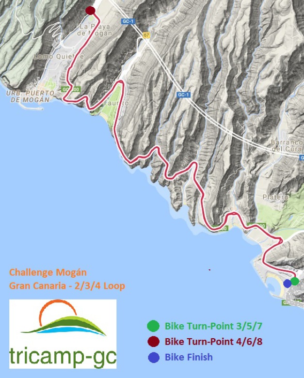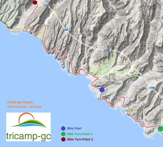 Die Radstrecke beginnt mit einer längeren Runde, die zunächst von der Playa de los Amadores nach Anfi del Mar führt. Von dort führt die Strecke vorbei an der Playa de los Amadores bis nach Puerto de Mogán. Wendepunkt ist der Kreisverkehr an der Disa-Tankstelle. Von hier führt die Strecke zurück zur Playa de los Amadores.