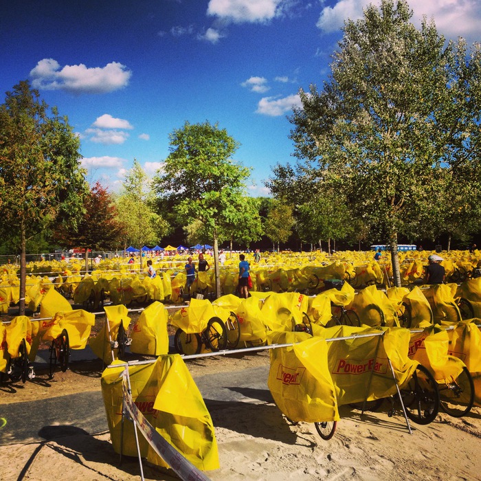 In der Wechselzone geht es eng zu. Also kann es schon mal unfreiwillig dazu kommen, dass sich etwas verstellt hat. Sollte dieser "Outside-Check" zu irgendwelchen Beanstandungen führen, ist jetzt noch Zeit sich Hilfe zu holen. Bei fast allen Veranstaltungen gibt es einen Bike-Service.