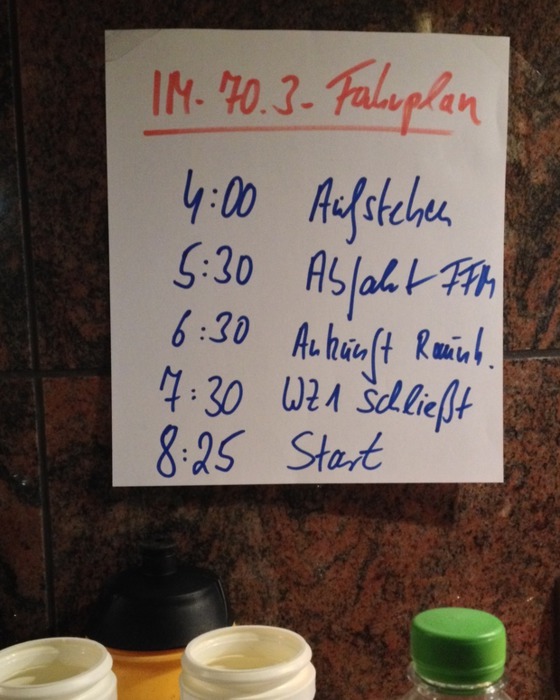 Abfahrt, Ankunft am Parkplatz, Ankunft in der Wechselzone, ... all das habe ich in einem exakten Fahrplan stehen. Mit Müdigkeit und Nervosität im Kopf, kann selbst damit noch einiges schief gehen.